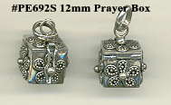 Item #PE692S - 12mm Bali Prayer Box All Sterling silver Hand etched, hinged. Approximately 12x12mm Heavy duty bail $7.50 each |  | Item #PE668L - 18mm Bali Prayer Box All Sterling silver Hand etched, hinged. Approximately 18x18mm Heavy duty bail $10.50 each |  | All handmade in Bali for us exclusively by families who are silversmiths. We are trying to give them as much business as possible to help the artists and their economy. Want to know about our "Bali Families"? There are three sizes in stock, each beautifully handstamped, hinged with a brass pin (for greater strength) and with a heavy duty bail for hanging as a pendant, charm, etc. The 12x12mm box is created from lots of teeny pieces of sterling silver. What is a prayer box? Apparently, you put your prayers in it, your wishes, and open it whenever you need to. These are very spiritual pieces. The ancient Tibetan Buddhist religion believed that putting your prayer into these boxes would ensure that it would be answered. Prayer box pendants were worn on chains that kept the prayer near the heart. Some designers fill them with medicinal herbs or aromatherapy botanicals. Naturally, you are the creator of each unique box's outcome and story. Sold by the piece. We also have Prayer Boxes in Pewter and more Bali and Bali Style beads and findings